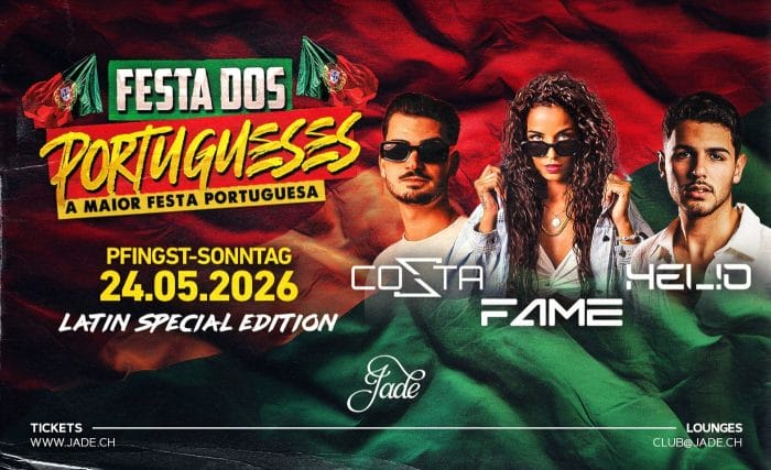 Festas dos Portugueses - Latin Special! vor Feiertag! Sonntag, 24.05.2026 Tür-/Kassenöffnung : 23:00 Ende: ca. 04:00 Veranstaltungsort: Jade Club Teilen Schliessen Sharing is caring Sonntag, 24.05.2026 Festas dos Portugueses - Latin Special! vor Feiertag! Kopieren Facebook X (Twitter) WhatsApp E-Mail In Bearbeitung... Tickets Vorverkauf Ticket — Auswählen —1234 CHF 25.00 Kaufen Anmeldung / Registrierung Bitte geben Sie Ihre E-Mail-Adresse ein, damit wir Ihnen die Bestätigung per E-Mail schicken können.E-Mail-Adresse Zurück Anmelden / Registrieren Altersüberprüfung Für diese Veranstaltung gilt ein Mindestalter von 18 Jahren.Geburtsdatum Zurück Weiter Bestellübersicht Bitte überprüfen Sie Ihre Bestellung für «Festas dos Portugueses - Latin Special!». Total Zurück Kaufen Bezahlung Um die Tickets direkt zu kaufen, wählen Sie bitte eine der folgenden Zahlungsarten.Der Betrag von CHF 0.00 für den Event «Festas dos Portugueses - Latin Special!» wird anschliessend autorisiert. Die tatsächlich Abbuchung von Ihrem Konto erfolgt erst nach der Bestätigung Ihrer Daten.Hinweis: Nachdem die Autorisierung abgeschlossen ist, erhalten Sie eine E-Mail an mit einem Bestätigungslink. Zurück Zahlung autorisieren Ihre Zahlung wird verarbeitet Sie werden in Kürze weitergeleitet… Bestätigung erforderlich Wir haben Ihnen per E-Mail eine Bestätigungsanfrage zugesandt. Ihre Reservation wird erst gültig, wenn Sie sie bestätigen. Das weitere Vorgehen ist in der E-Mail erklärt. Bestätigung erforderlich Wir haben Ihnen per E-Mail eine Bestätigungsanfrage zugesandt. Ihr Kauf wird erst gültig, wenn Sie sie bestätigen. Das weitere Vorgehen ist in der E-Mail erklärt. Reservation besteht bereits Sie haben bereits Tickets für dieses Event. Wenn Sie die Tickets ändern möchten, dann klicken Sie bitte auf den Link in Ihrer Bestätigungs-E-Mail.Wenn wir Ihnen die Bestätigungs-E-Mail noch einmal zuschicken sollen, klicken Sie bitte «Erneut senden». Erneut senden Ihre Reservation Wir haben Ihnen die letzte E-Mail noch einmal geschickt. Fehler Es wurde kein Benutzer oder eine bestätigte Reservierung für diese E-Mail-Adresse gefunden. Wenn Sie denken, dass dies ein Fehler ist, kontaktieren Sie uns bitte unter info@kaufleuten.ch. Reservation storniert Der Ticketkauf wurde erfolgreich storniert.Zurück zur Ticketauswahl Wir haben Ihnen eine E-Mail zur Anmeldung zugesandt. Nach dem Klick auf den Link in der E-Mail können Sie die Bestellung fortsetzen. Fehler Ihr Profil ist gesperrt. Wenn Sie glauben, dass dies ein Fehler ist, wenden Sie sich bitte an info@kaufleuten.ch. Fehler Wir konnten Ihnen die E-Mail für die Anmeldung nicht senden. Bitte versuchen Sie es erneut. In Bearbeitung... Verlosung An der Verlosung teilnehmen und gewinnen. Ticketverlosung Bestätigung Bitte geben Sie Ihre E-Mail-Adresse ein, damit wir Ihnen die Teilnahme bestätigen können.E-Mail-Adresse Zurück Teilnehmen Vielen Dank. Sie erhalten in Kürze eine E-Mail. Bitte bestätigen Sie Ihre Teilnahme an der Verlosung via dem angegebenen Link. tbc! Reservationen und AnfragenJade Clubclub@jade.ch+41 79 137 84 50 Einlass ab 18+ Veranstalter: Jade Club und Primo Events Weitere Veranstaltungen Alle Veranstaltungen anzeigen
