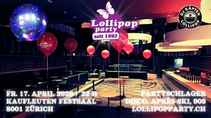 Immer nach dem Motto "Lollipop Party - irgendwie, irgendwo irgendwann" kehren wir in den Kaufleuten Festsaal zurück. Die wunderschöne Location mitten im Herzen von Zürich bittet beste Voraussetzungen zum Durchfeiern. Und natürlich mit "oben gute Laune - unten gute Laune - hinten gute Laune - vorne gute Laune" eigentlich überall super gute Laune. DJ Käpten Lollipop sorgt mit seinem unverwechselbaren Mix aus Partyschlager, Après-Ski, Disco & 90s dass ihr ganz neue Tanzformen entwickelt:)