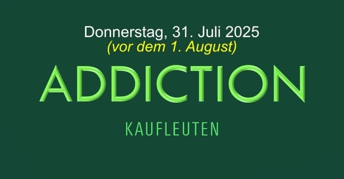 Am ersten Samstag im August, dem 2. August 2025, versammeln sich an der ADDICTION im Kaufleuten Klub wieder all diejenigen, die von guter Stimmung, erstklassigem Sound und den sonstigen schönen Dingen des Lebens nicht genug kriegen. Die 1a Soundmischung aus HipHop, R&B, Afrobeats, Dancehall & Reggaeton wird dir dabei von einem mittlerweile sagenumwobenen DJ Trio bespielt. Die DJs KER, Big Boys & Eles sorgen dafür, dass im wunderschönen Kaufleuten nur das Beste vom Besten aus der erstklassigen Soundanlage dröhnt und bis in die frühen Morgenstunden gelacht, gefeiert & getanzt wird. An diesem Samstag führt kein Weg um die ADDICTION und darum empfehlen wir dir, den besagten Samstag fett und mit Leuchtstift im Kalender zu markieren!